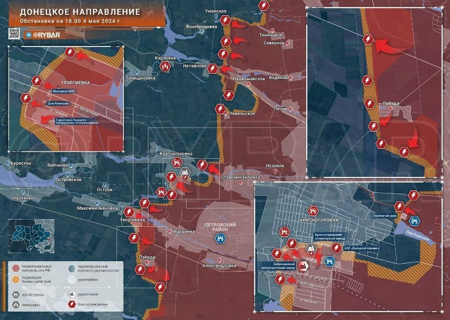 На Донецком фронте идут ожесточенные бои в центре Красногоровки. Ждем подтверждения информации о полном контроле армии России над заводом огнеупоров. Также наша армия продолжает забрасывать десант, в деле «Царь-мангалы» с РЭБ. ВСУ корректируют огонь по нашим с востока, от пруда Борисовка. ВС РФ расширяют зону контроля со стороны Старомихайловки. Активизировались атаки наших в Парасковиевке. Есть успехи и в селах Георгиевка и Победа, откуда давно не было новостей. Наши хорошо продвинулись в центре Георгиевки, зачистили посадки между ней и Победой.