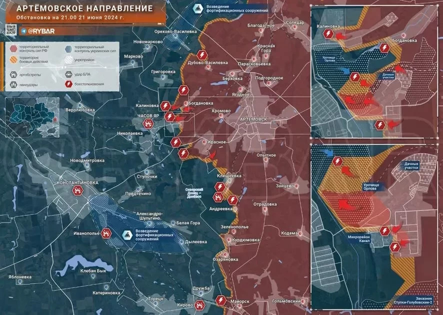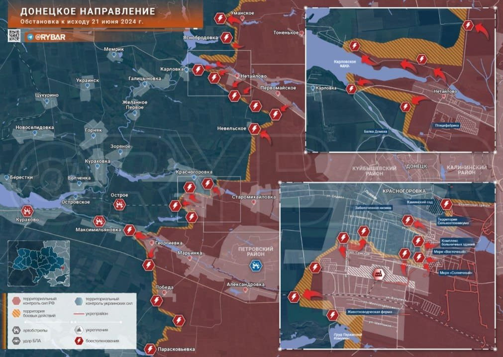 Сводки с различных направлений в зоне СВО, а также карты боевых действий на Украине на сегодня, 22 июня 2024 года. Инициатива на поле боя остаётся за российской армией. Каждый день от военкоров поступают сообщения о продвижении Вооружённых сил Российской Федерации (ВС РФ) на разных участках.