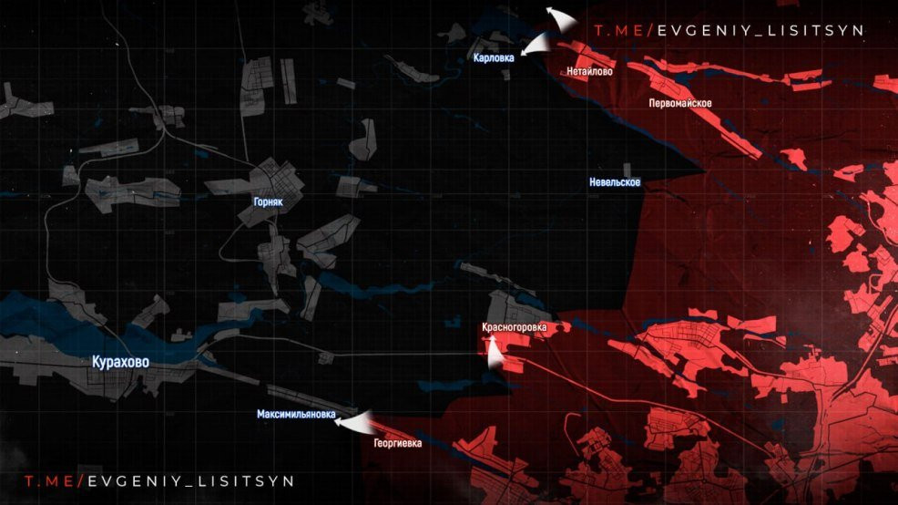 На Покровском направлении ВС РФ освободили Новоалександровку и продвигаются на запад, зацепившись за юго-восточную окраину Воздвиженки. В Карловке бои продолжаются на восточных окраинах, ВС РФ расширяют зону контроля по берегам водохранилища, информирует военкор Евгений Лисицын в своем Telegram-канале.