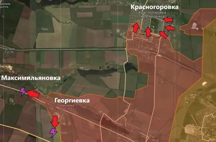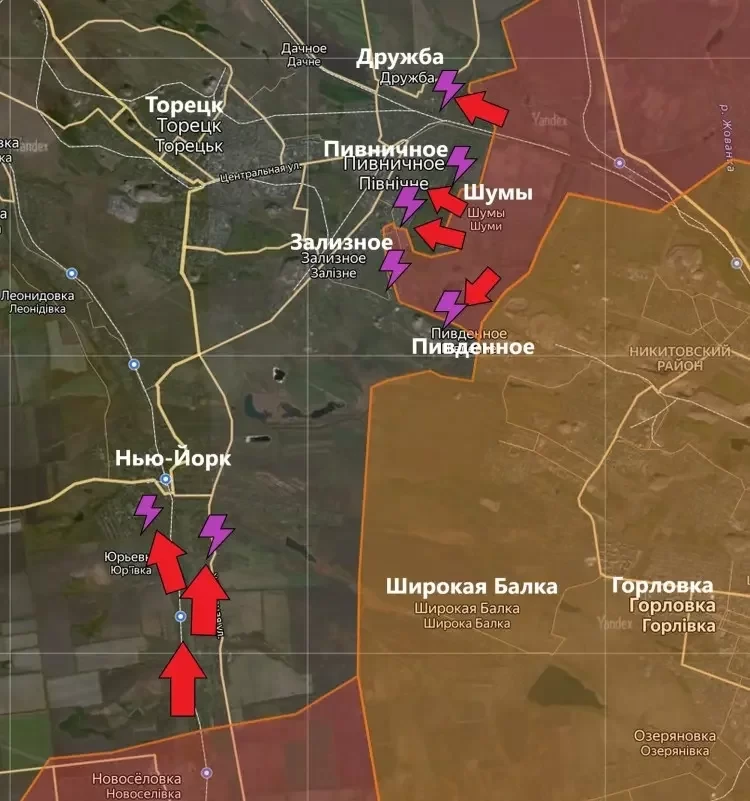 Помимо этого, наступление ВС РФ идёт в Дружбе, Пивничном (Кирово) и Зализном (Артёмово). Продолжаются бои и за Пивденное (Ленинское), где по-прежнему располагаются украинские формирования, пишет PulsePen.
