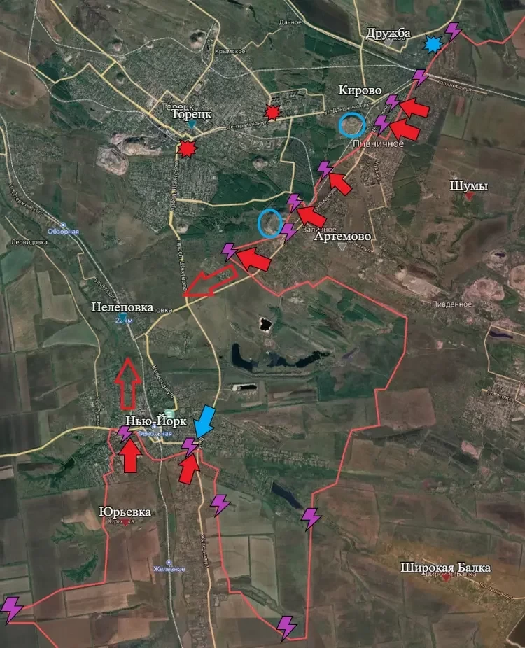 Одно из наиболее активных направлений последних недель - Торецкое. В Кирово ВС РФ существенно продвинулись в центральной части. Враг остаётся на подступах к террикону шахты “Северная”, а также на северо-западе пгт Кирово.