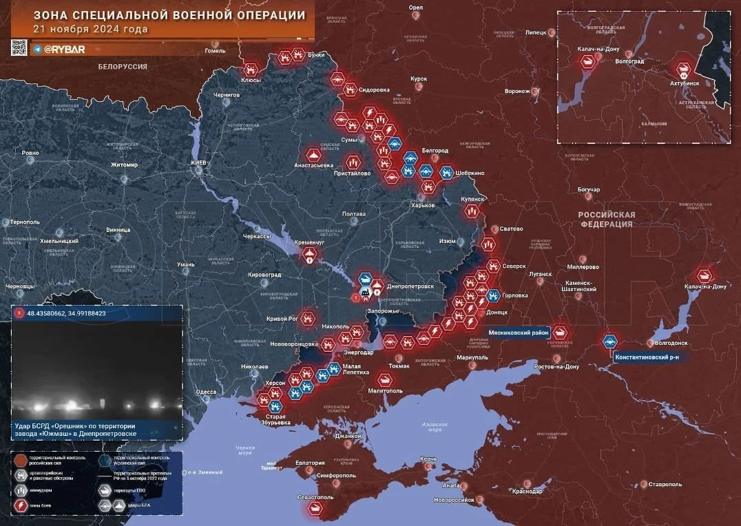 Российские войска впервые применили гиперзвуковую баллистическую ракету средней дальности (БРСД) «Орешник» по военным объектам на территории Украины. Целью стали производственные помещения военного завода «Южмаш» в Днепропетровске.