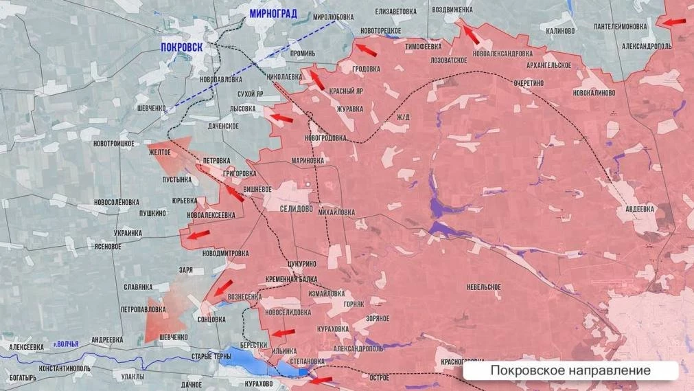 На Покровском фронте - продвижение в Берестках, село практически под нашим контролем. Судя по всему, сдают позиции ВСУ и в Солнцевке. Ближайшая цель - Старые Терны. Активно развивается расширение плацдарма западнее Селидово. Упорные бои идут в районе сел Юрьевка, Пустынка, Желтое, Пушкино и Заря, постепенно сдвигая довольно широкий фронт на запад. В районе Лысовки – Сухого Яра артиллерия пресекает контратаки и постоянно бьет по коммуникациям и позициям врага.
