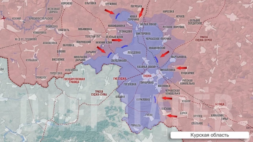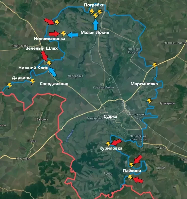 Продолжаются атаки наших войск на участках южнее и восточнее Суджи: есть продвижение в районе Плёхово, со стороны Махновки ВС РФ вошли в лесной массив и заняли его. Оттуда до Суджи немногим более 5 км.