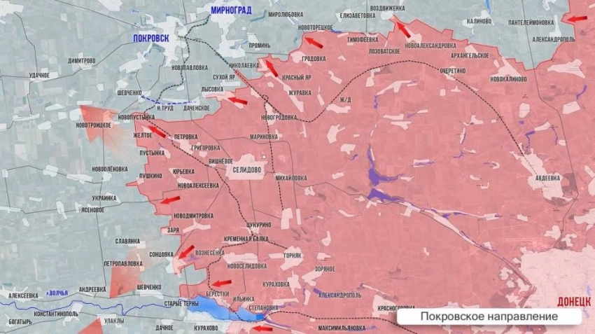 На Покровском направлении Минобороны объявило освобождение Берестков. Наши срезали карман между Старыми Тернами и Сонцовкой. Штурмуя северо-западную часть Солнцовки, продвинулись в полях по направлению к Заре. Формируя южный охват Покровска, наши выровняли линию между Жёлтым и Пушкино, а после освобождения Новопустынки вошли в Новотроицкое и Шевченко. И по последним данным ВС РФ уже зачищают Новотроицкое, из которого противник после неудачной контратаки, потеряв колонну техники, отвел войска в соседнюю Успеновку. Эту Успеновку не надо путать с селом на р. Сухие Ялы.
