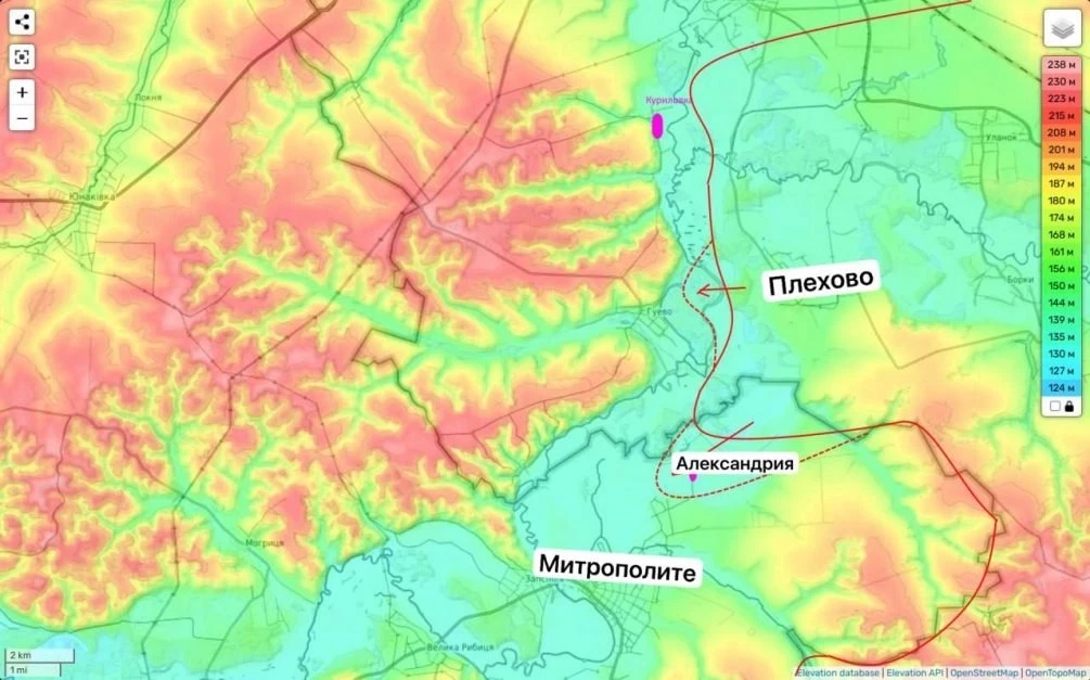 Ситуацию детально разобрал военный эксперт Юрий Подоляка и он призывает взять еще один населенный пункт на Сумщине - село Мирополье, который имеет серьезную логистику и от него в сторону областного центра идет заасфальтированная трасса. Подоляка продемонстрировал карту участка фронта с рельефом местности, чтобы было наглядно понятно причины маневра.