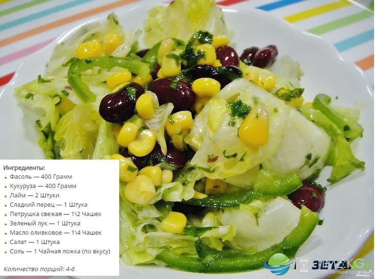 Салаты на скорую руку: мексиканский салат с фасолью. Салат подходит для вегетарианцев и постящихся. В салатнике смешивают фасоль, кукурузу, нарезанные лайм, перец, лук, зелень. Заправляют соком лайма с добавлением специй по вкусу. Листья салата рвут на кусочки и укладывают на порционное блюдо. Сверху выкладывают готовый салат.