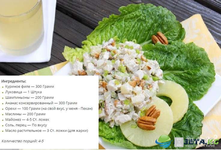 Салаты на скорую руку: Гектор. Основные ингредиенты салата Гектор – куриная грудка, орехи и майонез. Хозяйки дополняют основной набор любимыми продуктами. Мы предлагаем следующий рецепт. Куриное филе промывают, подсушивают, нарезают кубиками, перчат, солят и обжаривают на сковороде 8-9 минут, до румяной корочки. Туда же добавляют промытые и нарезанные лук, шампиньоны. Ананас подсушивают салфеткой и нарезают кубиками, маслины рекомендуется нарезать дольками. Салат следует посолить ,поперчить и заправить майонезом. Подавать на листьях салатах, посыпав измельченными орехами.