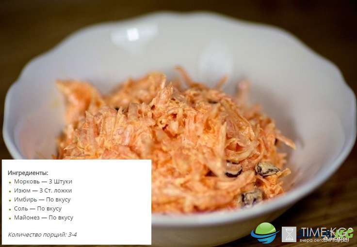 Салаты на скорую руку: морковный с имбирем. Изюм замачивают на 5 минут в теплой воде. Примерно 3 сантиметра корня имбиря натирают на мелкой терке. На крупной терке натирают свежую морковь. Воду из изюма сливают, ингредиенты перемешивают и заправляют салат майонезом. Можно украсить его зеленью или розочкой из имбиря.