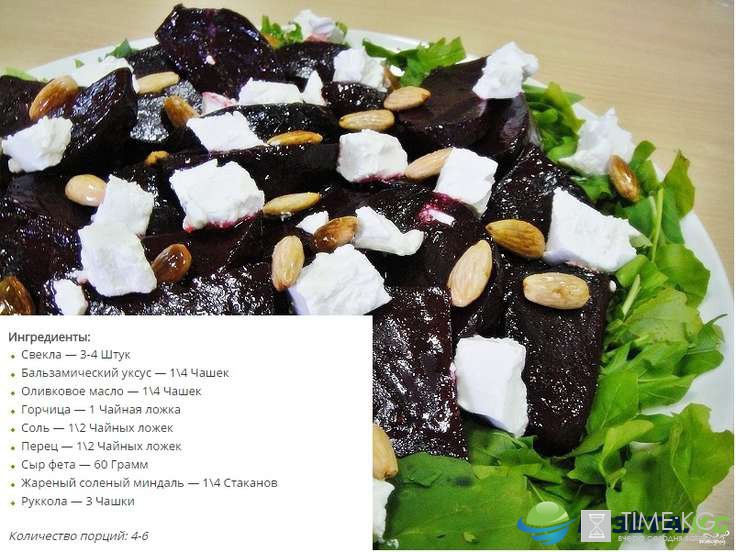 3-4 средних свеклы нужно помыть, завернуть в фольгу и запечь до готовности в духовом шкафу при 220 градусах. Когда свекла остынет, ее нарезают небольшими дольками, а сыр фета нарезают кубиками. На красивое блюдо выкладывают измельченную рукколу, далее следуют свекольные дольки, сырные кубики и жареный соленый миндаль. Салат заправляют смесью горчицы, уксуса, соли и оливкового масла.