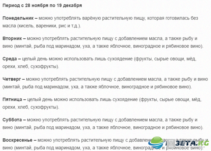 Рождественский пост 2016-2017: 28 ноября, календарь питания по дням, что можно есть. Пост- это не просто диета, это ограничения с целью очищения духовного и физического, перед предстоящим праздником Рождества. Полностью запрещены: яйца, молоко, мясо, сливочное масло. Разрешается употребление растительных масел после вечери в «строгие дни» понедельник, среду и пятницу, в другие дни в любое время. Постящимся разрешена рыба, которую может быть на столе в выходные и праздники церкви, исключая «строгие дни». Церковь не рекомендует тонизирующие напитки такие, как кофе, крепкий чай, алкоголь.