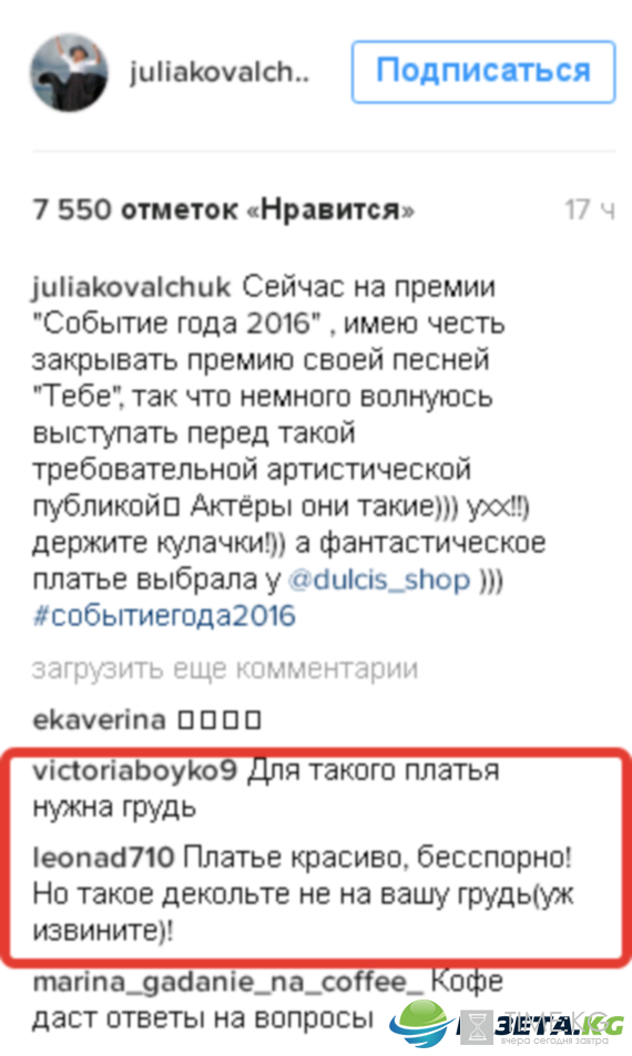 Сама Юля на своей страничке поделилась с подписчиками своими страхами перед выступлением, та как ей выпала честь закрывать «Событие года 2016» своей песней «Тебе». «Немного волнуюсь выступать перед такой требовательной артистической публикой. Актеры они такие, ухх!» - сообщила певица.