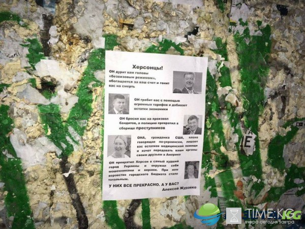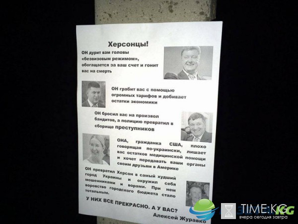 «Листовки от Журавко: сорвать и не пущать. В районе Голая пристань, в Цюрюпинске, Херсоне расклеиваются листовки антипорошенковского содержания. Власти пытались сорвать их, но их расклеивают снова. СБУ считает , что за этой акцией стоит экс-депутат Алексей Журавко. Его фамилия и стоит под листовками. Сам он этого не отрицает, о чем написал в своем Фейсбуке. СБУ, прокуратура дали команду всем херсонским СМИ не упоминать о нем и его акции. Экс-депутат давно стал головной болью для херсонской власти за свои посты в соцсетях и распространение антиправительственных материалов на Херсонщине. Сам он не собирается сбавлять обороты и готовит новые сюрпризы для местной бандеровской власти.»