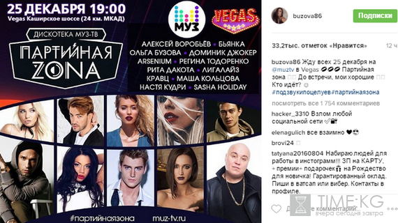 21 декабря девушка анонсировала на своей странице в социальной сети Инстаграм телевизионную дискотеку со звездами в прямом эфире канала «МУЗ-ТВ». «Жду всех 25 декабря на «МУЗ-ТВ» в Vegas, Партийная зона. До встречи, мои хорошие! Кто идёт?» - написала Ольга.