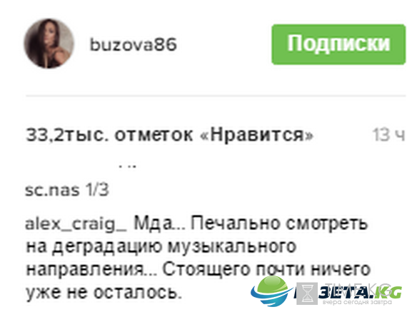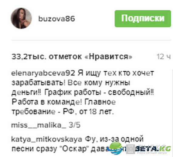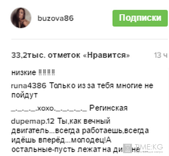 «Ого! Вот это да! Одна песня и уже на одной сцене со знаменитыми звёздами! Круто!», «Фу, из-за одной песни сразу «Оскар» давать что ли», «А как же бронхит... зеленкой прижгла?», «Никто!», «Мда... Печально смотреть на деградацию музыкального направления... Стоящего почти ничего уже не осталось», «Ты,как вечный двигатель... всегда работаешь, всегда идёшь вперёд... молодец! А остальные - пусть лежат на диване...», «Только из-за тебя многие не пойдут», «Красава. Во развод, как попёр. Тарасов в жопе. Умничка, утри нос всем злопыхателям», «Какая из Бузовой певица, ноль!», «Ну и составчик, Бьянка там самая крутая и то ...», – стали комментировать подписчики Бузовой.