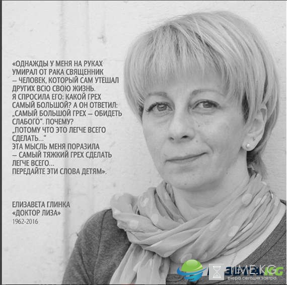 Доктор Лиза разбилась в самолёте 25.12.2016: Елизавета Глинка - доктор с «огромным сердцем». Елизавета Глинка родилась в Москве, в феврале 1962 года. Её отец был военным. Закончила в 1986 году медицинский институт имени Пирогова по специальности детского реаниматолога. Она всегда хотела быть врачом, поэтому профессиональная деятельность захватила её полностью. Помогать людям в наше непростое время стало смыслом жизни. Из-за работы мужа, доктор оказалась в Украине. С того момента началась её активная помощь хосписам Киева, Москвы, Армении, Сербии. В 2007 году Елизавета создаёт фонд «Справедливая помощь», который все собираемые средства направляет на помощь больным, бездомным, а также жертвам природных и военных катаклизмов. Всё происходящее с Украиной Доктор Лиза наблюдала не с экрана телевизора, а лично, помогая вывозить раненых и больных детей на территорию России. Однажды врач сказала, что не видела русских военных в Украине, тем самым нажила себе врагов. Смерть, которую она все же боялась, её не останавливала и она говорила: «Мы никогда не уверены в том, что вернемся назад живыми, потому что война – это ад на Земле. И я знаю, о чем я говорю. Но мы уверены в том, что добро, сострадание и милосердие работают сильнее любого оружия". Имея прекрасную семью и трех сыновей Доктор могла бы отдавать себя своим родным, но её сердца хватало на всех.