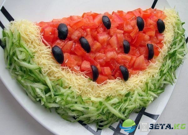 Этот салат — «король» любой вечеринки. Особенно ко двору он придется за новогодним столом, когда за окном холод и снег, а часто вообще слякоть с дождем. Кому же не захочется такого сюрприза — увидеть на своем столе настоящую дольку арбуза — яркую, алую, с черными точками-косточками? Изюминка блюда — что за его «кричащей» внешностью можно скрыть любое нутро, будь то куриный, говяжий или вообще вегетарианский-овощной легкий салатик.
