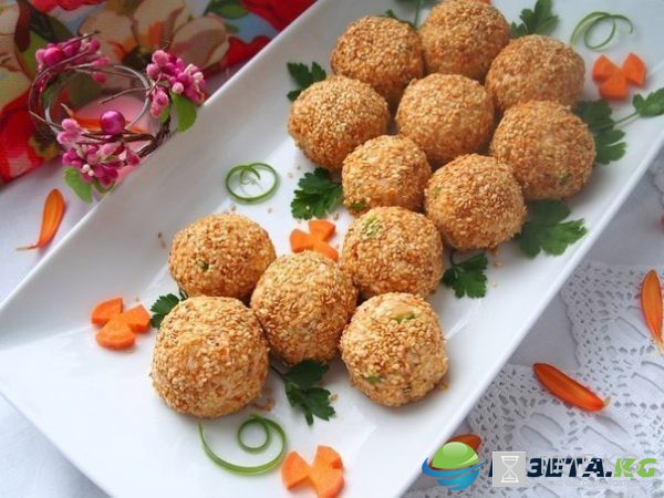 Обжаренный на сухой раскаленной сковороде кунжут, для придания ему золотистого блеска разложить равномерным слоем на прямой поверхности. Каждый шарик обвалять в кунжуте и выложить на блюдо.