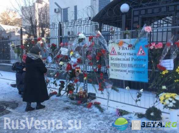 К Российскому посольству в Киеве люди идут и идут с цветами. Некоторые просто постоять, сняв шапки (цветы купить сегодня не все могут).