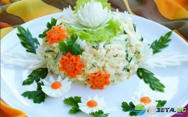 САЛАТ "МОНИКА" ЗАТМИТ И "ШУБУ" И "ОЛИВЬЕ"! Очень вкусный, нежный и сочный салатик. Готовится очень быстро из самых доступных продуктов. Такой салат с достоинством украсит любой праздничный стол! Ингредиенты: капуста китайская - 300 г грудка куриная - 1 шт. яйца куриные - 4 шт. огурец - 2 шт. лук - 1 шт. уксус - 60 мл майонез - по вкусу соль перец черный Луковицу очистить, нарезать и залить уксусом и водой 1:1 и оставить мариноваться. Капусту нарезать небольшими кубиками или соломкой. Куриную грудку я использовала от курицы-гриль, что придало салату особую пикантность, но можно и просто отварную взять. Грудку нарезать кубиками и добавить к капусте. Огурцы нарезать небольшими брусочками и добавить к курице. Слить жидкость с нарезанной луковицы и соединить все ингредиенты, посолить, поперчить и заправить майонезом. Перемешать. Украсить на свое усмотрение. У меня украшение - цветы из моркови, лука и яиц, листья - из огурца и капусты. Приятного аппетита!