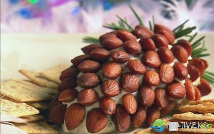 Салат Шишка Ингредиенты: Сливочный сыр - 300 грамм Ветчина – 200 грамм Кедровые орешки – 50 грамм Укроп – 20 грамм Майонез – 50 грамм Миндаль – для украшения Соль, чеснок – по вкусу Крекеры со вкусом бекона Рецепт: Ветчину нарезаем очень мелкими кубиками. Сливочный сыр взбиваем блендером с предварительно нарезанным укропом (веточку укропа оставляем для украшения), чесноком (можно не добавлять), майонезом и солью. Взбитый сыр выкладываем в другую посуду и добавляем кубики ветчины и кедровые орехи, солим массу и хорошо перемешиваем ложкой. Ставим салат в холодильник на 20 минут. Миндаль подсушиваем в духовке или на сковороде, периодически помешивая в течение 15-20 минут. Охлажденный салат выкладываем на блюдо, в котором он будет подаваться в форме шишки и украшаем миндальными орешками острым концом к себе (смотрите фото), а толстый конец шишки украшаем веточкой укропа. При подаче гарнируем такой салат крекерами со вкусом бекона.