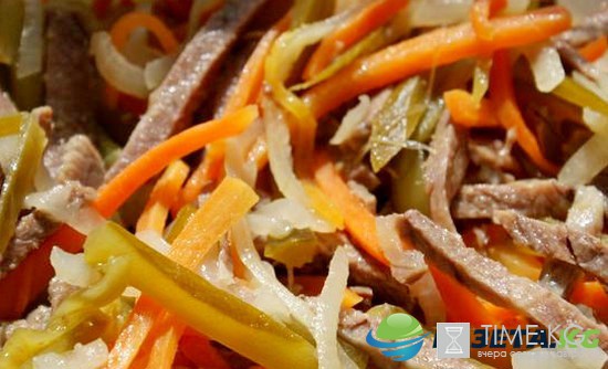 Репчатый лук нарезать кубиками, морковь полосочками (как огурчики). На растительном масле обжарить до мягкости лук и морковь. Следите, чтобы огонь был не сильный, иначе овощи могут подгореть и испортить вкус салата.