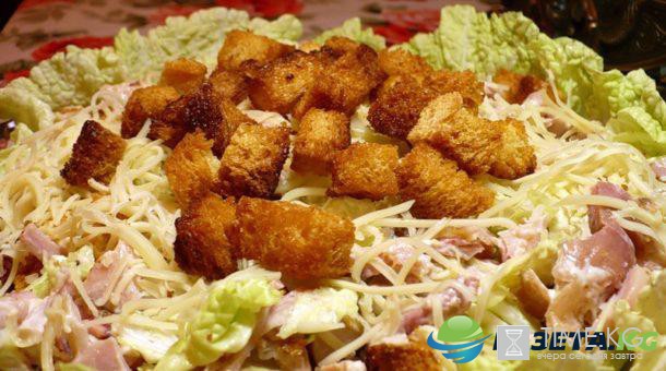 Нарежьте соломкой пекинскую капусту, добавьте нарезанные копчености и лук, перед самой подачей на стол добавьте сухарики, смешайте все ингредиенты с майонезом и посыпьте тертым сыром.