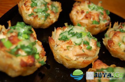 Натираем сыр на мелкой терке. Выкладываем в хлебные тарелочки начинку, посыпаем тертым сыром и зеленью. В заранее разогретую до 180 градусов духовку отправляем корзиночки с жульеном, чтобы сыр запекся, а хлеб стал хрустящим.