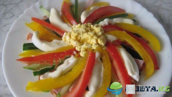 На большое плоское блюдо выложить по кругу все ингредиенты. Первый слой – лук и ветчина, которые нужно разложить попеременно. Второй слой – дольки перца и яичного белка. Третий слой – помидоры, между дольками которых нужно нарисовать полоски из сметаны. В центр "фейерверка" засыпать яичные желтки.