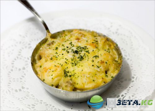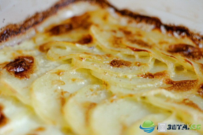 Заливаем блюдо сметано-сливочным соусом со специями и сверху посыпаем тертым сыром. Разогреем духовку до 200 градусов и запекаем Гратен в течение 40 минут.