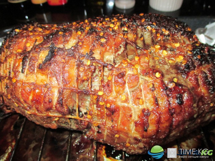 В процессе приготовления систематически через каждые 10 минут поливаем мясо соусом.