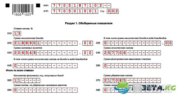 В данном разделе заполняющий должен указать суммарный показатель всех сотрудников. В том случае, если используются разные ставки НДФЛ, следует заполнить несколько образов раздела №1 — это строки с 010 по 050. Все остальные строки, а именно 060-090 будут общими. Отметим, что данные таким способом заносятся только на первом экземпляре.