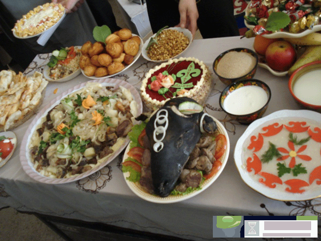Обязательный плов и, конечно же, манты. Но это только начало. Разнообразнейшие блюда мусульманской кухни можно увидеть на столе. Как по рецептам, передаваемые женщинам старшими в роду, так и сваренные по новомодным рецептам. На столах, покрытых праздничными скатертями также много всевозможных сладостей, фруктов и овощей.