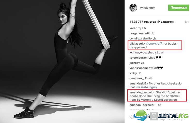 «Она не думала, что ее грудь получится такой маленькой и расплющенной», «Надо было добавить фотошопа» - заметили неугомонные подписчики. Стоит отметить, что выказав пренебрежение к ракурсу груди, Кайли Дженнер не забыла выставить свою знаменитую «пятую точку» в выигрышной позе. А чёрные обтягивающие лосины только подчеркнули все прелести, расположенные ниже талии.