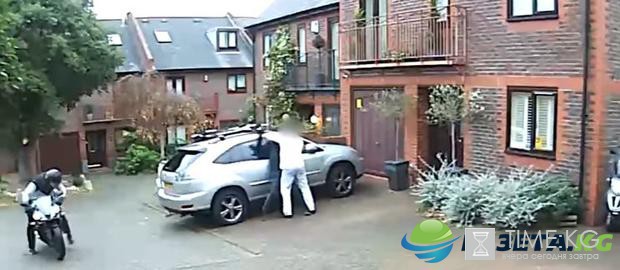 В ролике видно, как один из преступников пытается завести мотоцикл, в то время как его сообщник нападает на 46-летнего мужчину, размахивая нунчаками.