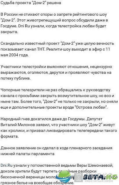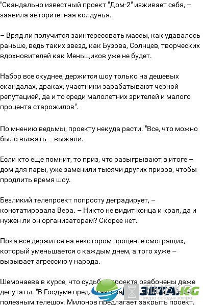 Не воздержалась от комментариев по этому поводу и экстрасенс Вера Шемонаева, спрогнозировав закрытие «Дома 2» не позднее, чем через полтора года. Причем, по мнению все той же Шемонаевой, у продюсеров не будет особого выбора, ведь истинными почитателями реалити-шоу останутся считанные единицы.