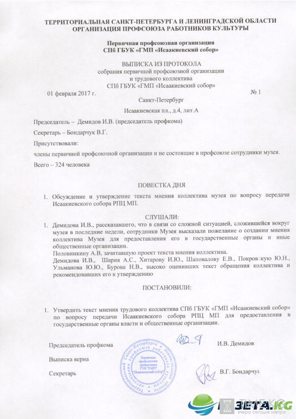 Утверждено на собрании первичной профсоюзной организации и трудового коллектива организации СПб ГБУК «ГМП «Исаакиевский собор» 01 февраля 2017 г.»