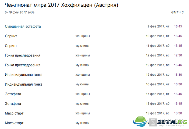 ЧМ по биатлону 2017: когда и где, расписание, состав сборной России. Важнейшее событие года для биатлонистов состоится совсем скоро. С 9 по 19 февраля в Австрии, Хохфильцен, состоятся зрелищные соревнования, в результате которых будет разыграно 11 комплектов медалей. Транслировать гонки будут сразу три телеканала: «Матч.ТВ», «Евроспорт» и Первый канал.
