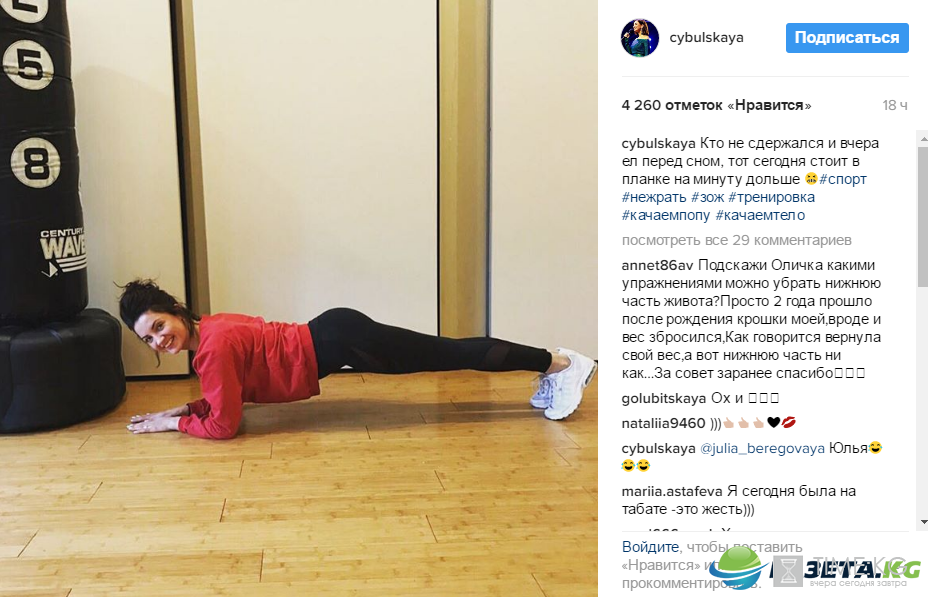 «Кто не сдержался и вчера ел перед сном, тот сегодня стоит в планке на минуту дольше», — подписала снимок Ольга Цибульская.