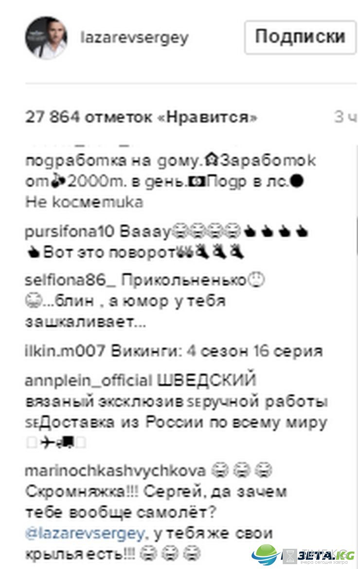 «Вы этого достойны!», «Наверное, в честь какого-нибудь инженера однофамильца», «Ха ха ха ха, хештэги от Бога. Я ору», «Сереж, семейный самолет это то что надо… , мне нравится», «И на С сфотошопить, прям мастер», «По приметам авиации, не хорошо называть самолеты именами живых людей!», «Сережа, молодец. Хорошее чувство юмора. И не только! Так держать!», «Скромняжка! Сергей, да зачем тебе вообще самолёт? Сергей Лазарев, у тебя же свои крылья есть!», «В Сочи есть целый Лазаревский район с улицей имени маршала Лазарева. До замужества, пока я носила свою девичью фамилию - Лазарева, мой препод по гражданскому меня подкалывал, говоря, что целый район назван моей фамилией. Теперь я Рыжковская», «Приятного полета!», «Антарктиду Лазарев открыл», «В Алматы тоже есть улицы Лазарева! Да ты прям знаменит», «Сергей Вячеславович, научите меня, пожалуйста, так же угарно хештеги писать», - отнеслись с чувством юмора фолловеры Лазарева.