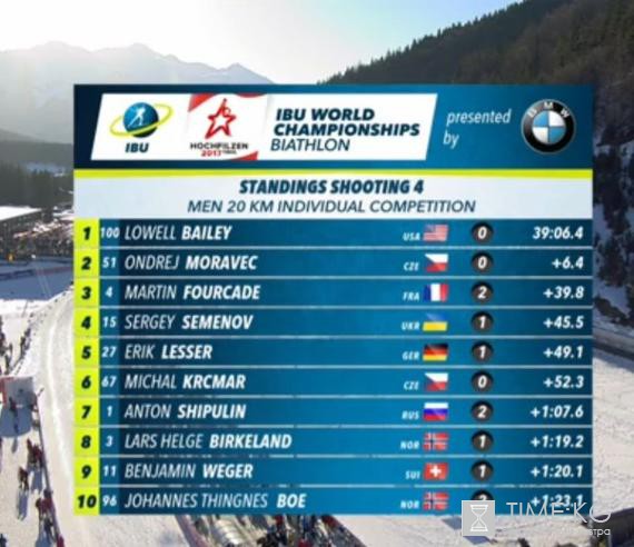 Биатлон результаты мужской индивидуальной гонки сегодня 16.02.17. 102 биатлониста вышли на ЧМ 2017 . Сегодня 16.02.17 мужчины пробежали индивидуальную гонку. 20 километров. Фавориты Мартен Фуркад и Антон Шипулин допустили промахи на рубежах. Антон ушел с первой «лежки», не закрыв 2 мишени. Логинов и вовсе, на первом стрельбище «промазал» три раза, на втором два, всего 7 мишеней не закрыты. Мартен, так же, как и Шипулин не закрыл две мишени, но по скорости француз быстрее Антона. Надежды на медаль в биатлоне таяли с каждой минутой. У мужчин отличную стрельбу и хороший ход показал Беньямин Вегер из Швейцарии, но последняя «стойка» окончилась промахом. Сергею Семенову также удалось показать отличные результаты. На третьей стрельбе один промах отстранил его от золотой медали. Евгений Гараничев не смог так же отстрелять стойку на 0, один промах добавляет ему штрафную минуту, всего в «индивидуалке» Евгений промахнулся трижды. Отметим, что все биатлонисты стреляли сегодня плохо. Единственные, кто отстрелял на 0 сегодня – чехи Моравец и Крчмар. Именно последний вновь оттеснил Антона. Шипулин ушел на 6 место. Лоауэлл Бейли из США отстрелял на 0, и он боролся за 1 место на ЧМ 2017. Результаты индивидуальной гонки на сегодняшний день таковы: американец Лоуэлл Бейли одерживает историческую победу, второй Моравец, а Мартен Фуркад обладатель бронзы.