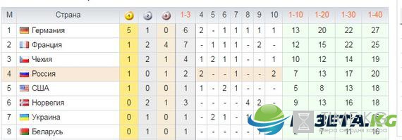 Вчерашняя победа сборной России продвинула команду на 4 место в медальном зачете. Немцы являются лидерами. Следом идут французы и чехи. Будем верить в то, что сегодняшние результаты станут отличными для наших спортсменов.