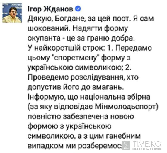 Об этом инциденте на своей страничке в Фэйсбук рассказал «разъярённый» фотограф мэрии Богдан Досюк. Фотограф был возмущен тем, что представители команд из Волыни через раз говорили на украинском языке, так еще один из участников расхаживал в куртке с российским гербом. Досюка совсем не интересует, что парень наполовину сирота и эту куртку ему подарили. В своем посту он обратился к Министру спорта Украины Игорю Жданову, с требованием немедленно купить мальчику украинскую форму. По мнению Досюка, на Украине «не так уж и много сирот», поэтому можно их всех снабдить спортивными формами. Тот в свою очередь ответил, что этому «спортсмену» передадут форму и обязательно проведут расследование по поводу того кто пустил парня на соревнование «в таком виде».
