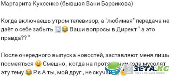 Зрители «Дома 2» неоднократно отмечали, что в выпусках новостей телепроекта далеко не всегда раскрываются все факты. Впрочем, в этом нет ничего удивительного, ведь главная функция этих выпусков – заинтриговать зрителей, усилив ожидание будущих эфиров. Так, на днях бывшая девушка Ивана Барзикова Маргарита Куксенко опровергла заявления Кати Жужи, что в скором времени она прилетит на Сейшелы к Ване, пишет сайт www.gazeta.kg.