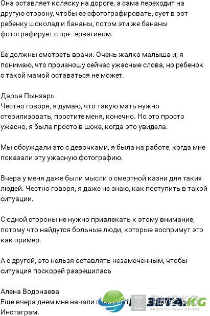 Ужасные фото некой Екатерины, которая умудрилась кормить своего ребенка с помощью вещей из сек*-шопа взбудоражили едва ли не весь интернет. Не остались в стороне от этого вопиющего случая и многие звезды отечественного шоу-бизнеса. Так, например, Ксения Бородина высказала мнение, что поведение этой женщины совершенно недопустимо и к ней должны быть приняты меры со стороны соответствующих органов, пишет сайт www.gazeta.kg.