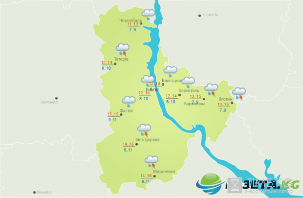 - Вышгород: температура ночью +8…10, днем +12…14. С утра и до самого вечера небо в Вышгороде будет скрыто за облаками. Ночной сильный дождь утром ослабнет и вскоре закончится.