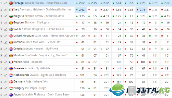 Согласно новому прогнозу от евроэкспертов, сегодня победит Сальвадор Собрал, чья чувственная и очень спокойная песня Amar pelos dois поразила многих. Габбани сместился на одну позицию вниз. Фронтмен O.Torvald Женя Галич пообещать сделать татуировку с изображением этого исполнителя, если победит участник от Португалии. А третье место букмекеры по-прежнему пророчат 17-летнему болгарскому певцу Кристиану Костову, который отметился выступлениями на российском детском песенном конкурсе “Голос.Дети” и в оккупированном Крыму.