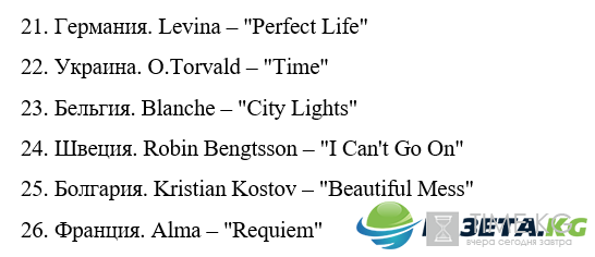 Ниже приведен список всех участников, которым посчастливилось попасть в финал. Группа O.Torvald попала в него сразу, поскольку наша страна в этом году является принимающей стороной. Украина выступит на “Евровидении” 22-й по счету.