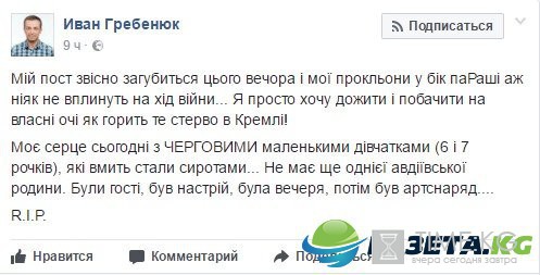 "Мое сердце сегодня с ОЧЕРЕДНЫМИ маленькими девочками (6 и 7 лет), которые вмиг стали сиротами... Не стало еще одной авдеевской семьи. Были гости, было настроение, был ужин, потом был артснаряд....R. I. P.", - написал он в Facebook.