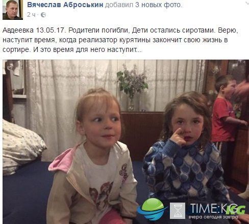 "Авдеевка 13.05.2017. Эти две девочки остались сиротами. Верю, что реализатор курятины свою жизнь закончит в сортире, и это время для него обязательно наступит", - Аброськин